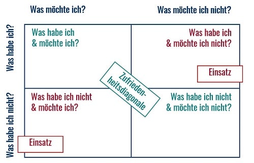 Einerseits die beiden Fragen: „Was möchte ich?“ und „Was möchte ich nicht?“ in Kombination mit andererseits „Was habe ich?“ und „Was habe ich nicht?“