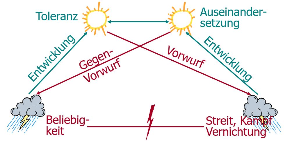 Denn die Schattenseite der Toleranz ist die Beliebigkeit und die Schattenseite der Auseinandersetzung ist Streit, Kampf und Vernichtung. In seinem Buch „Eris und Eirene“ appelliert er: Statt den Gegenwert in der Übertreibung abzuwerten, sollte man ihn nutzen, um in der eigenen Sonnenseite zu bleiben.