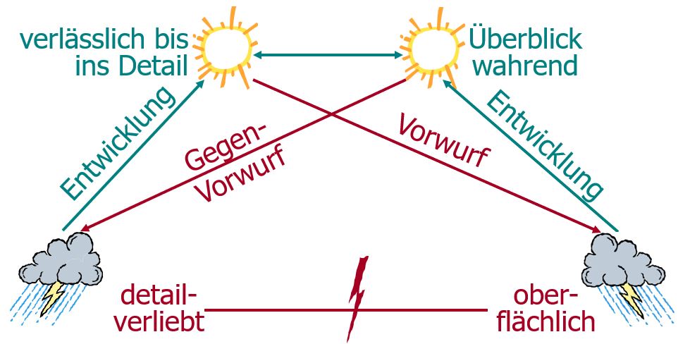 Das Werte- und Entwicklungs-Trapez von Friedemann Schultz von Thun hilft, sich von der bewertenden Bipolarität zwischen „Himmel und Hölle“, „gut und schlecht“, „Stärken und Schwächen“ bzw. „sehr gut und nicht genügend“ so weit zu distanzieren, dass die positiven Funktionalitäten sichtbar werden: In unserer Kultur ist Abwertung ein häufiges Phänomen. So wirft der Gewissenhafte dem anderen vor, oberflächlich zu sein. Der revanchiert sich mit „Du bist so penibel und detailverliebt“. Einem Vorwurf folgt, je nach Temperament, eine Rechtfertigung oder der Gegenangriff.