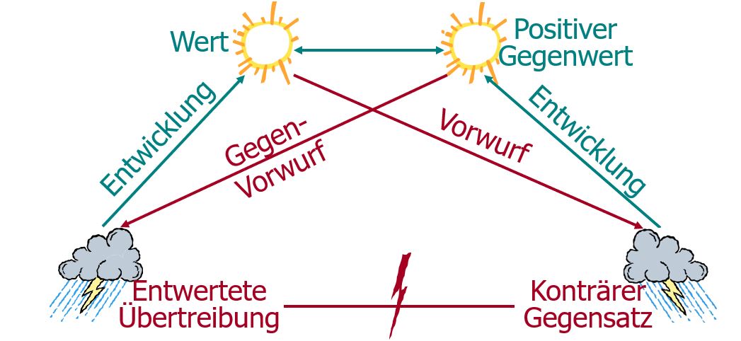 Das Werteviereck bietet sich an, um aus dem, was einem an anderen stört und den Vorwürfen, mit denen man selbst konfrontiert wird, die positiven Funktionalitäten herauszuschälen und wertschätzende Kooperation zwischen positiven Gegenwerten zu ermöglichen – frei nach Paracelsus, der gemeint hat: