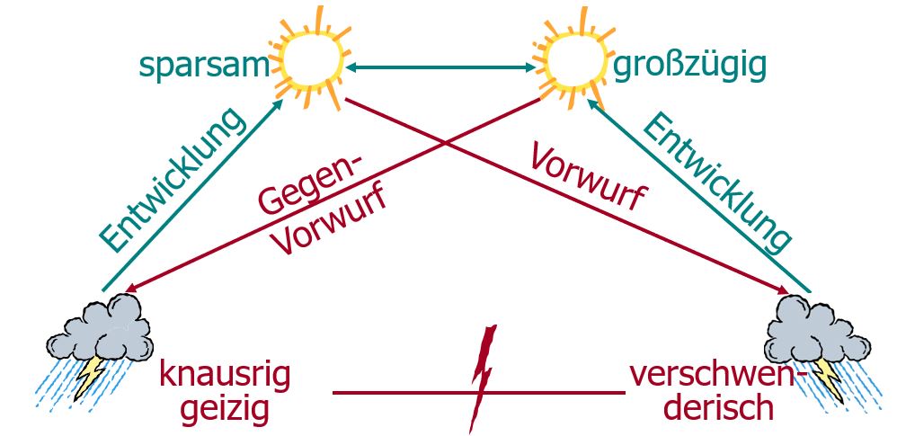 Wenn in einer Beziehung, der/die Eine sparsam und der/die Andere großzügig ist, kann der/die Sparsame helfen, dass die Großzügigkeit nicht in die Verschwendungssucht kippt und der/die Großzügige sorgt dafür, dass die Sparsamkeit nicht zu Geiz und Knausrigkeit ausartet.